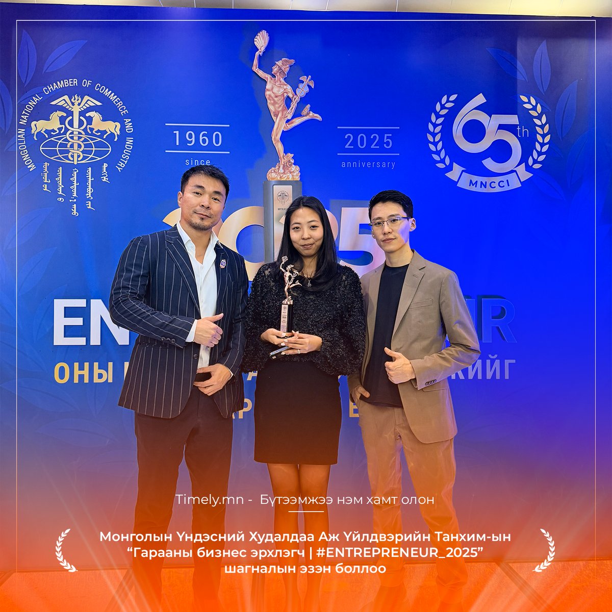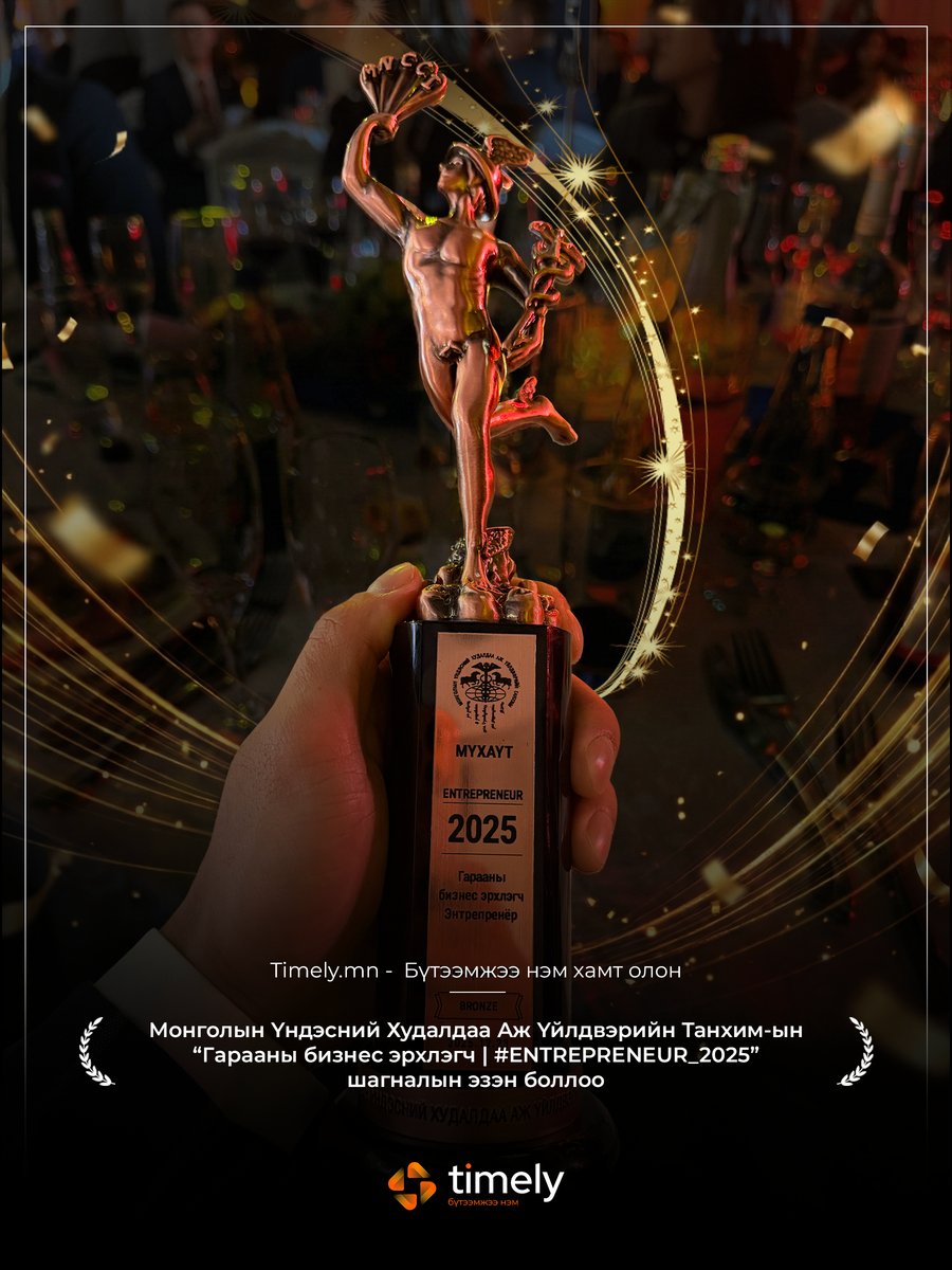 Монголын Үндэсний Худалдаа Аж Үйлдвэрийн Танхимаас жил бүр уламжлал болгон Монгол Улсын нийгэм, эдийн засагт бодит хувь нэмэр оруулж буй аж ахуй нэгжүүдийг тодруулдаг ENTREPRENEUR-2025 шагнал гардуулах ёслол 28 дахь жилдээ амжилттай зохион байгуулагдлаа. Энэ үеэр Timely ухаалаг цаг бүртгэлийн анхдагч платформ “ШИЛДЭГ ГАРААНЫ БИЗНЕС ЭРХЛЭГЧ” шагналын эзэн болж, салбартаа амжилтаараа тэргүүлсэн байна.